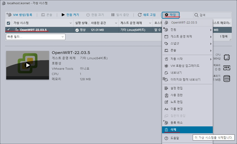 22. 데이터스토어 정리를 위해서 작업한 가상 시스템을 제거한다.