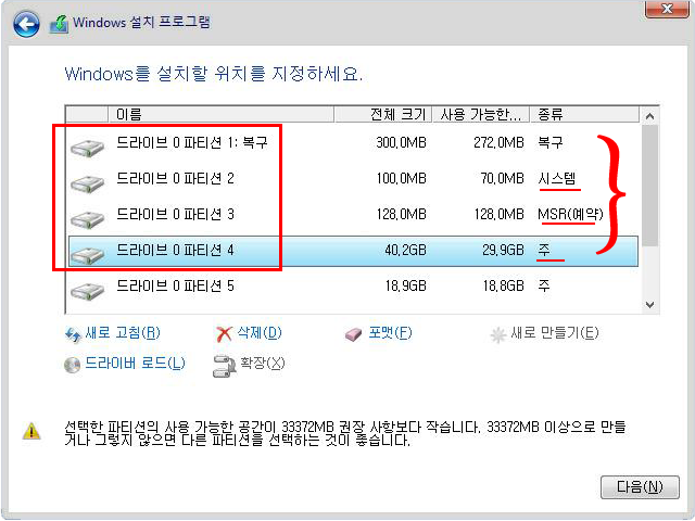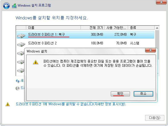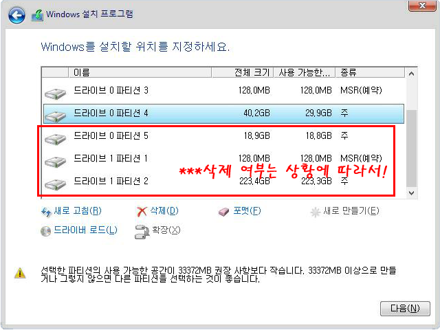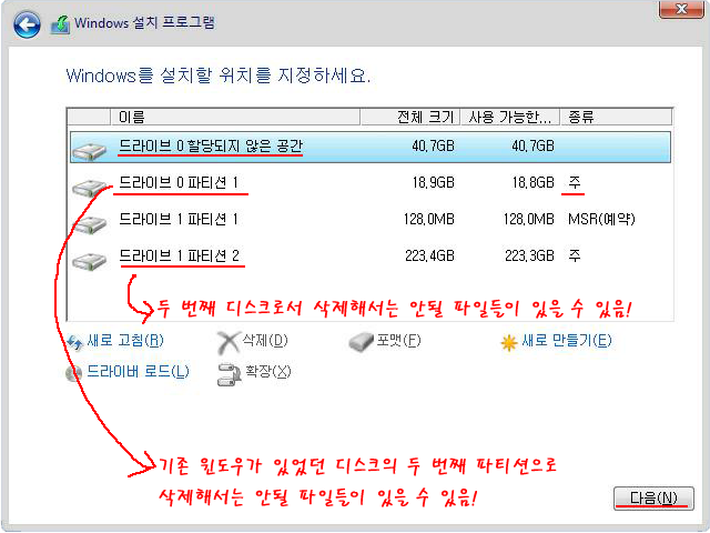 기존 드라이브(디스크) 주 파티션이 2개 이상 보인다면 하나의 디스크를 나눈 것이며 윈도우 파티션을 제외한 나머지들은 어떡게 할지 신중히 결정한다.