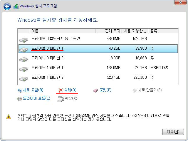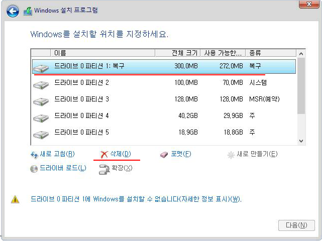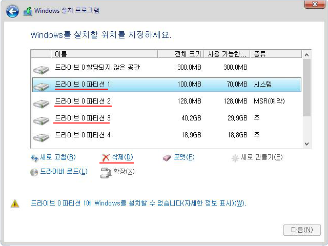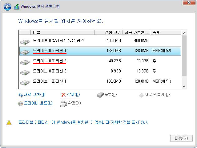 8. 윈도우 관련 파티션들을 삭제한다.