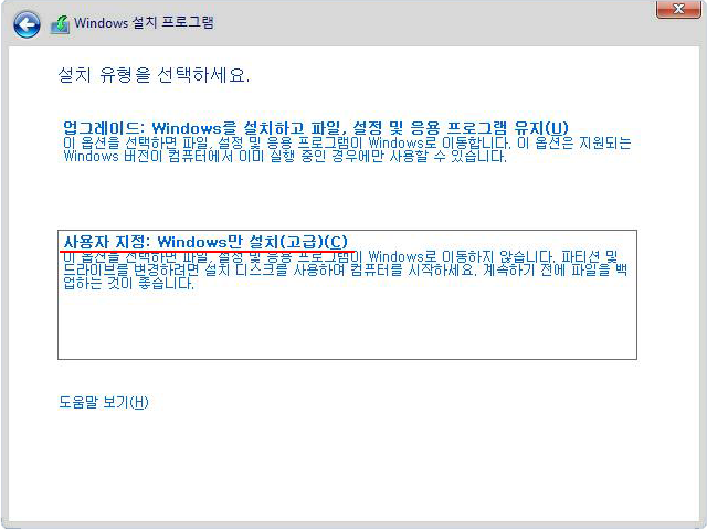 6. 사용자 지정: Windows만 설치(고급)로 한다.