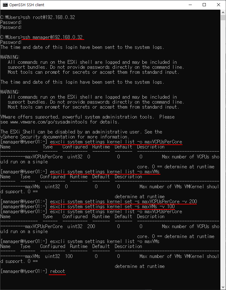 명령프롬프트로 ESXi에 쉘로 접속한다.