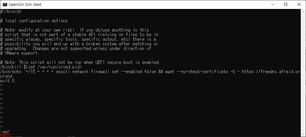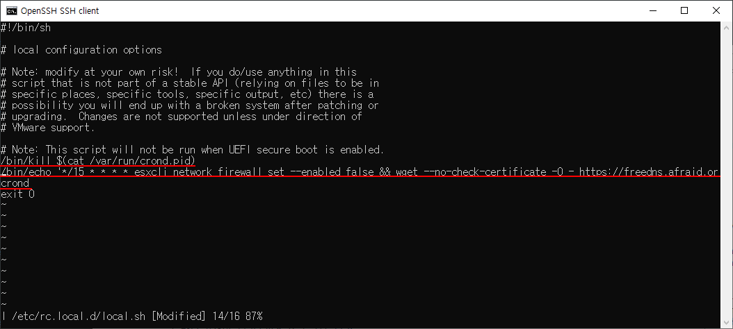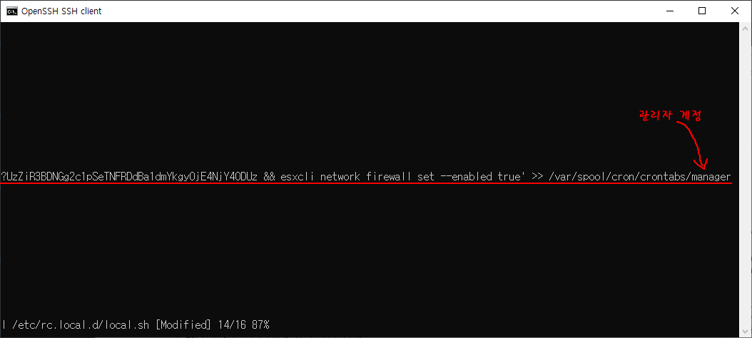 /bin/echo '*/15 * * * * esxcli network firewall set --enabled false && 업데이트코드 && esxcli network firewall set --enabled true' >> /var/spool/cron/crontabs/manager