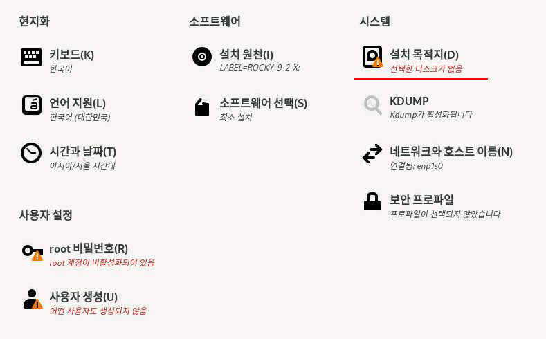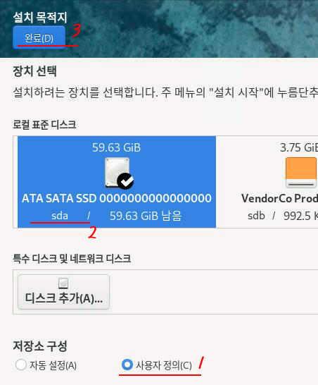 설치요약 화면에서 디스크 선택으로 들어간다.