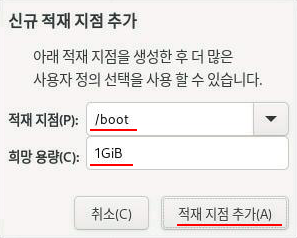나머지 공간은 모두 루트(/) 파티션으로 잡는다.