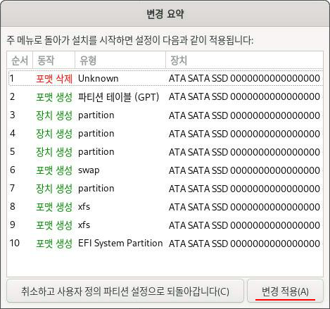 파티션 생성과 포맷진행 여부를 확인하고 변경을 적용한다.