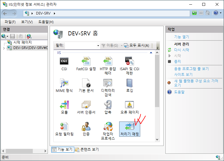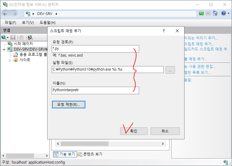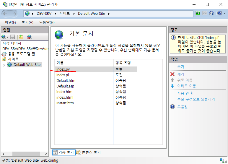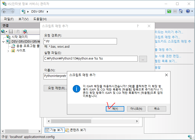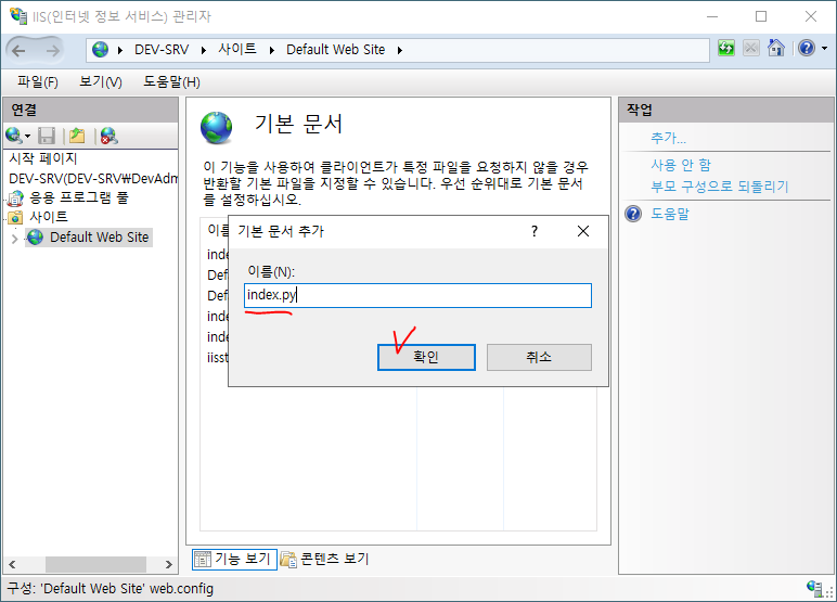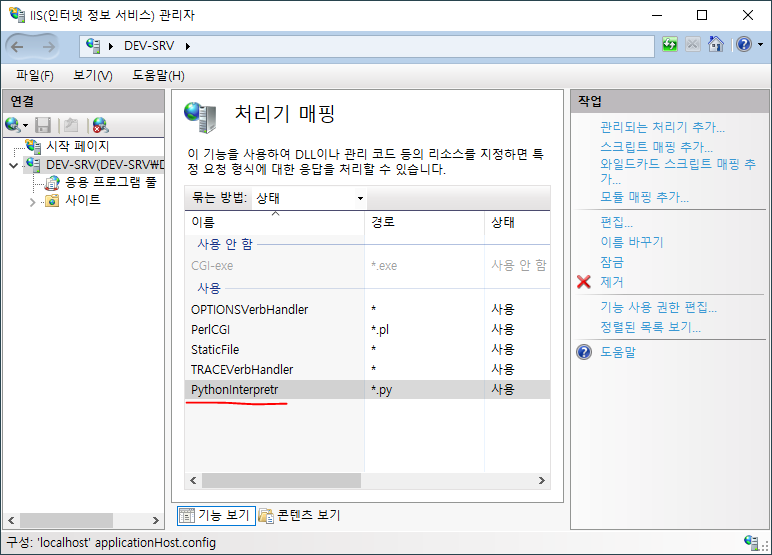 Python과 연동할 CGI 추가를 역활 및 기능 추가 마법사로 진행한다.