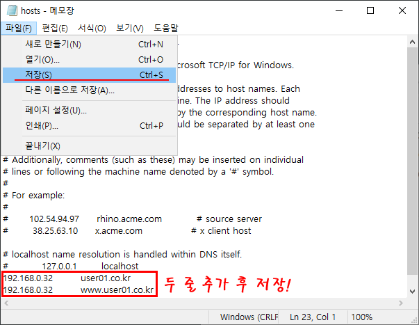 먼저, 접속에 사용할 컴퓨터의 hosts 파일을 편집한다.